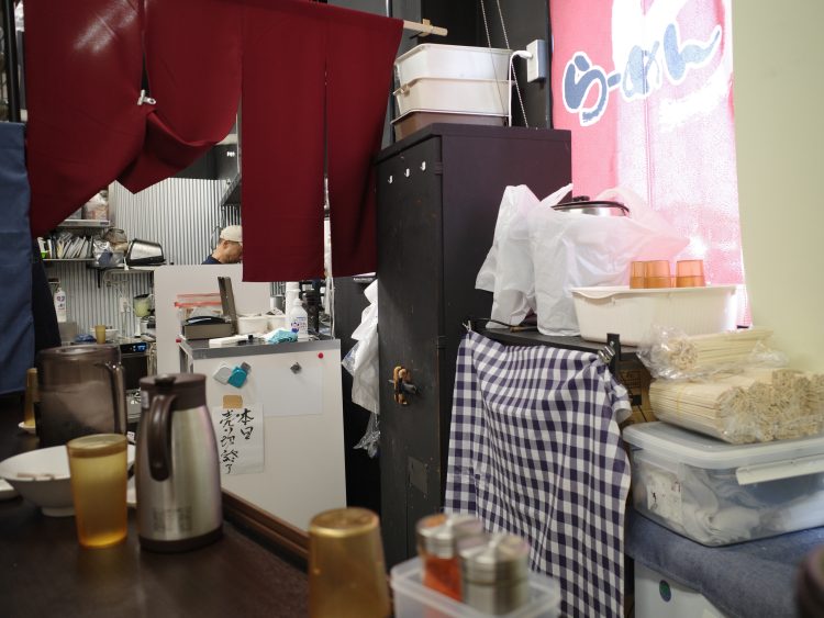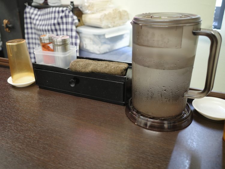 カウンター上にあるのは、シンプルに水と胡椒と七味と割り箸入れ。