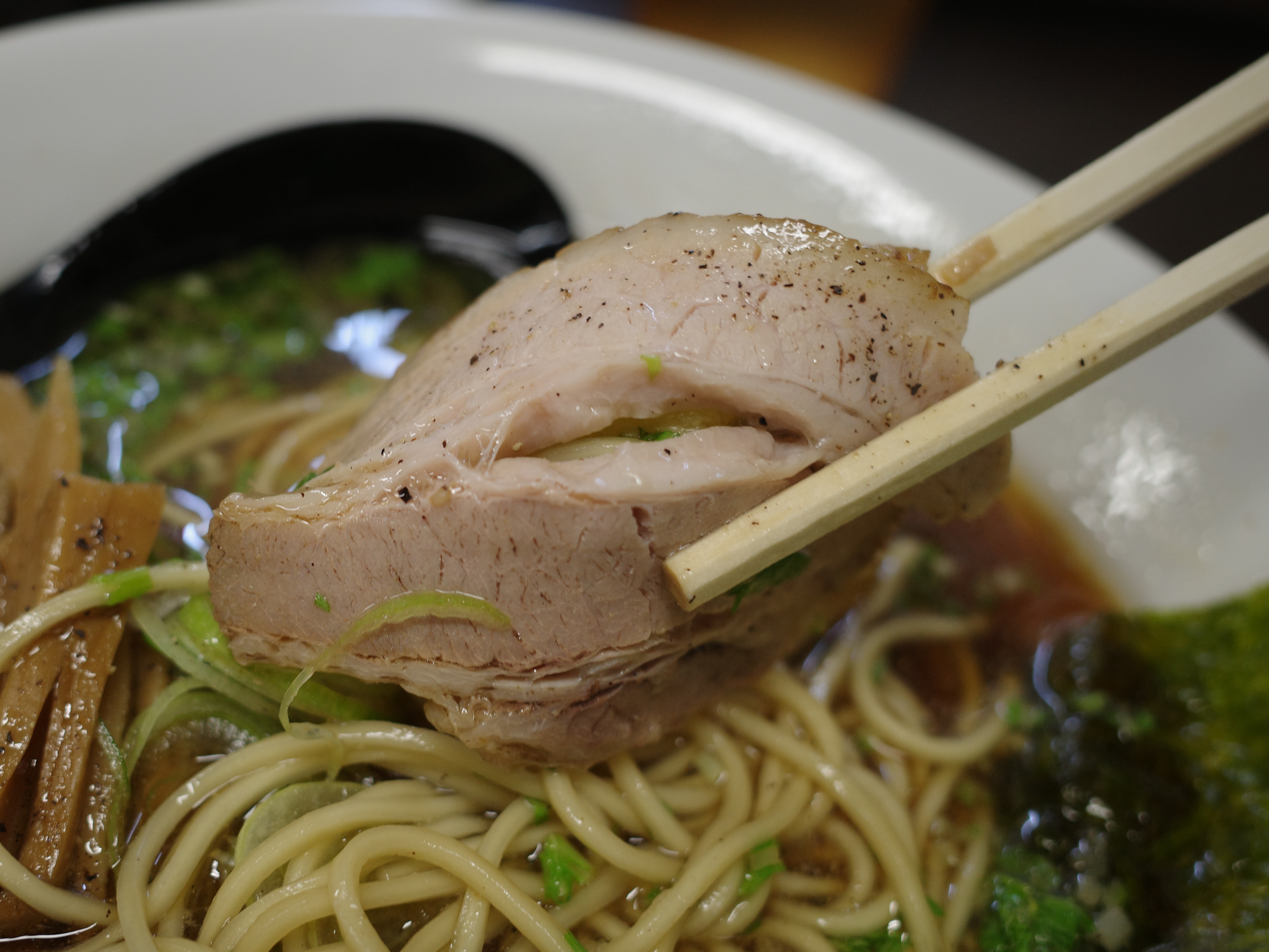 トッピングは、チャーシュー、メンマ、ネギが二種類に海苔と柚皮。