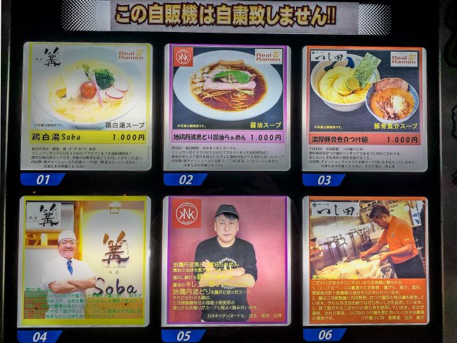 お店は定期的に入れ替えるようですが、この日販売されていたのは5種類で、鶏白湯(篝)、とり醤油(カネキッチンヌードル)、魚介つけ麺(つじ田)、背脂生姜醤油(我武者羅)、塩(らあめん元)と、バランスの良いラインナップ。