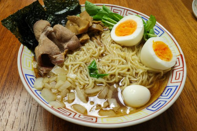 調理例を参考に、刻み玉ねぎ、三つ葉、メンマ、チャーシューを調達し、空腹だったので茹で卵を多めにトッピング。