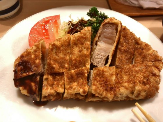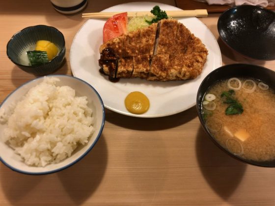 寡黙なご亭主がカツに衣をつけ、油が低温なのか時間をかけ、火の通り具合を確認しながら順番通りにトンカツを揚げていき、女将さんはお客のお茶など気を配りながらもう一人の女性スタッフと配膳の準備をし、揚がって切れ目を入れられたカツを、前もってサラダが盛られて調理台に並べられた白いお皿に盛り付けていく。