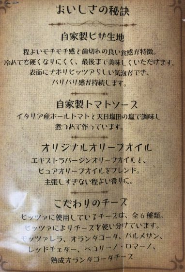 店内にあったリーフレットも読むと、冷めても硬くなりにくく、パリパリ感が持続する自家製パイ生地と、ピザ毎に使い分けられた全6種類のチーズが美味しさの秘訣だと猛烈アピールしています。