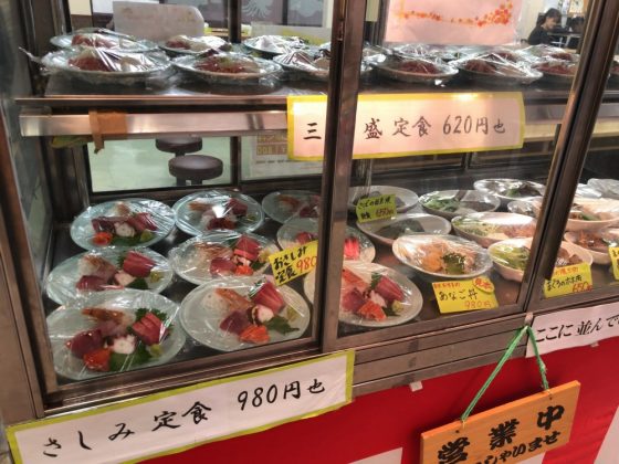 シャッターに貼り付けられたメニューを見ると、丼物や握り寿司、それに刺身などの定食が各種揃っています。