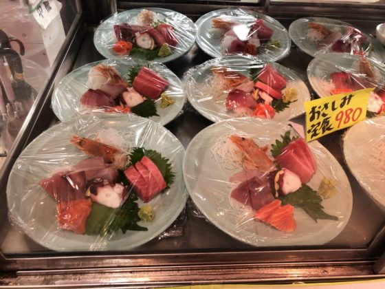 刺身定食などの定食類を食べたい時は、まず食券を買ってから保冷ケースの棚に行き、中からメインのおかずを自分で選びとり、席まで持って行ってから券を渡すと、店員さんがご飯・味噌汁と小鉢を持ってきてくれるという手順。