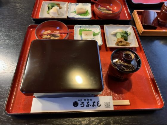 お盆には、鰻重の他に小皿3つと肝吸い付き。